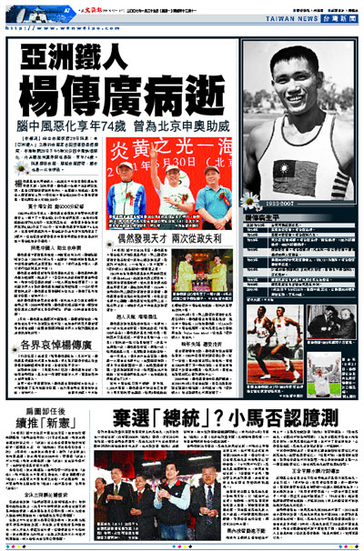 【本報訊】綜合台灣媒體28日消息:有「亞洲鐵人」之稱的台灣著名田徑運動員楊傳廣,本港時間28日下午5時30分因中風病情惡化,在美國加州寓所與世長辭,享年74歲。消息傳回台灣,震驚台灣體壇,親友也是一片哀悼聲。