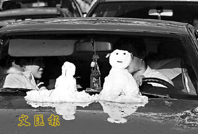 28日合歡山降大雪後放晴,有大批遊客上山賞雪玩雪。一對情侶在車輛引擎蓋上堆起一對雪人,塞車時在車上看雪人談心。 中央社