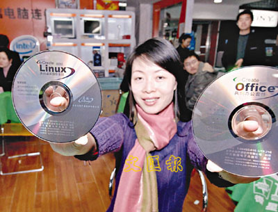 ■ 西安市版權局工作人員在展示低價國產正版軟件。資料圖片