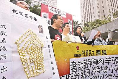 ■長毛與社民連線成員到梁家傑記者會現場,高舉橫額及喊叫口號。 本報記者劉國權 攝