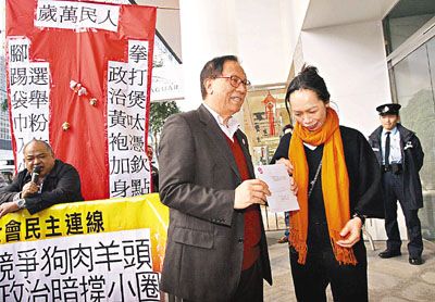 民主黨立法會議員楊森代表梁家傑,前往曾蔭權競選辦公室遞交邀請信,邀請特首曾蔭權出席3月15日於會展舉行的特首候選人答問會。他稱,把活動定於會展舉行,是希望除800人選委外,大眾市民亦可出席,聆聽兩位候選人辯論各項公共政策;並已通告立法會主席范徐麗泰充任大會主席。邀請信由競選辦發言人游淑儀代表接收。 ■本報記者 譚可盈