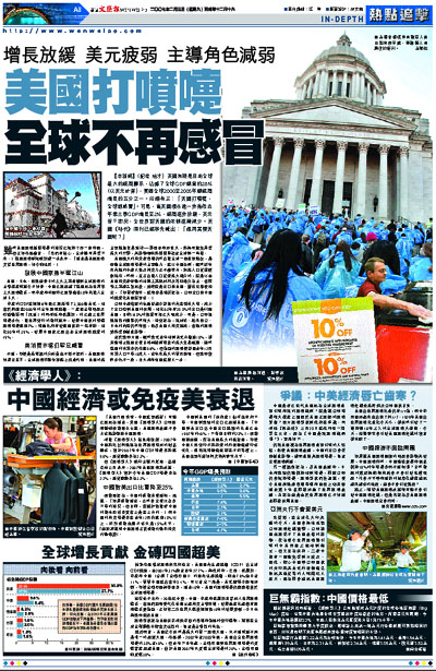 【本報訊】(記者 荊才)美國無疑是目前全球最大的經濟體系,佔據了全球GDP總量的28%(以美元計算),貢獻全球2000至2006年總經濟增長的五分之一。俗語有云:「美國打噴嚏,全球都感冒」。可是,當美國樓市進一步拖低去年第三季GDP增長至2%,經濟逐步放緩,美元每下愈況,全世界對美國的依賴逐漸減少。美國《時代》周刊已經率先喊出:「誰再需要美國呢?」