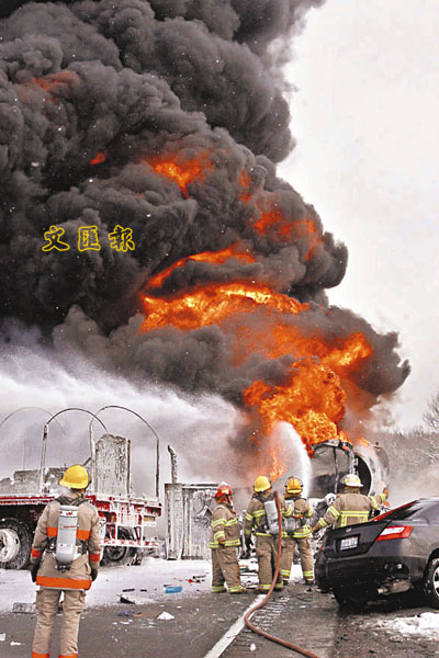 ■加國風雪釀車禍大火,消防員到場灌救。 美聯社