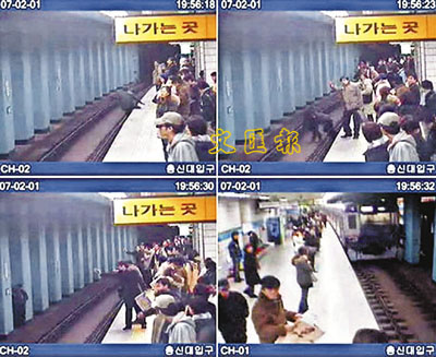 韓國首爾地鐵4號線總神大學入口站周四晚上8時發生墮軌意外,一名醉漢失足。跌入軌道後,上班族趙某迅速跳下月台抓住對方,費力地躲在軌道旁邊的支柱間。列車正急速駛至,情況相當危險,幸好兩人都平安無事。 韓國《朝鮮日報》