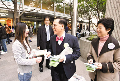 ■曾蔭權及夫人日前於中環派傳單。 資料圖片