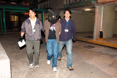 涉以飲品落毒意圖勒索的歹徒26歲姓譚,家住順天h天琴樓。昨深夜11時15分,疑犯雙手扣上「孖葉」被警方黑頭套蒙頭以客貨車載返天琴樓,由兩名重案組探員押下車上樓搜屋,逗留約20分鐘才離開,並帶走一盒錄影帶。