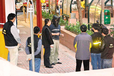 港島總區重案組探員,昨午將疑犯帶到灣仔天樂里、杜老誌道及金紫荊廣場等地重組案情,疑犯被黑布蒙頭,腰間纏上鐵鏈。期間,探員用攝錄機拍下整個過程,約20多分鐘後離去。