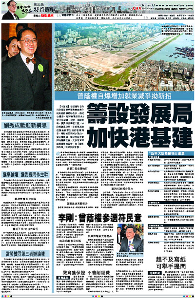 有出席政綱介紹會的選委透露,曾蔭權向他們表示,一旦成功連任的話,便會改組現時的3司11局,其中一個構思是把目前一些負責城市規劃的工作歸納在一起,成立一個新的政策局,叫做「發展局」,統籌工程項目的執行,落實政府每年投放290億元於基建項目的承諾。