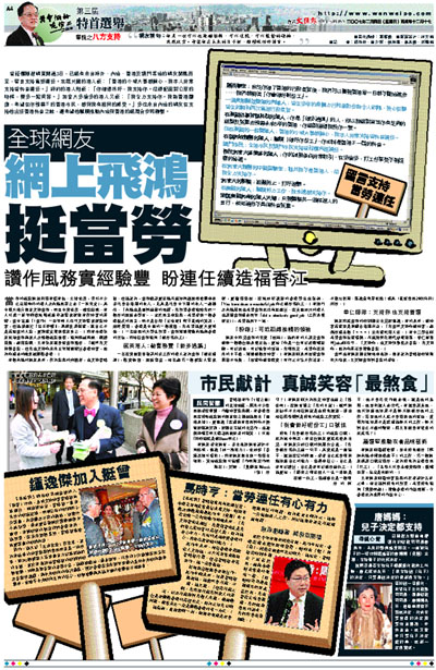 曾蔭權競選網頁開通3日,已經有來自海外、內地、香港及澳門等地的網友聞風而至,留言支持當勞連任。定居英國的港人說:「香港的小城大事都關心,我本人非常支持曾特首連任。」紐約的港人則說:「你做得很好,我支持你。但謹記面對公眾的時候,要多一點笑容。」加拿大多倫多的港人又說:「我全力支持你。我為香港驕傲,希望在你領導下的香港市民,都與我有相同的感受。」多位來自內地的網友在支持他出任香港特首之餘,還希望他繼續推動內地與香港的經濟合作和聯繫。