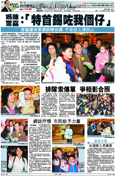 【本報訊】曾蔭權以「我會做好呢份工」作為參選口號,向「老闆」─香港市民表明「以民為本」的施政理念。在緊張的競選行程中,曾蔭權除了忙於向選委們解釋政綱外,傍晚時分又攜同曾太落區走訪,往將軍澳一個商場與一眾市民作親身接觸,了解他們的想法。