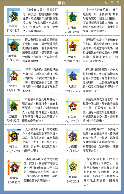 「一年之計在於春」,就在這新的一年,來個新的計劃和好的突破吧!案頭上的擺設,不妨重新整理及作出調動,這對於在風象星座之下出生的你來說,會是幸運的。