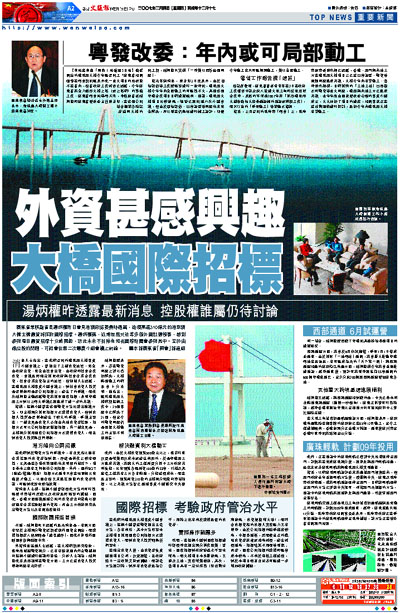 不過,湯炳權昨日透露的最新消息是,有關方面有鑒於主橋部分融資近期受到外國資金關注,而選擇招標者入圍原則是「越寬越好」,因此不排除外國財團會參與競標中來。