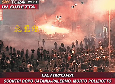 暴力陰影持續籠罩意大利球壇,繼上周末一名業餘足球隊的職員被毆打致死後,前晚當地甲組足球聯賽卡坦尼亞主場迎戰巴勒莫的賽事又發生激烈的球迷衝突,騷亂造成一名在場維持秩序的防暴警察喪生,另有逾百人受傷。事後意大利足總宣布,無限期押後包括國內聯賽及國家隊比賽等所有足球賽事。