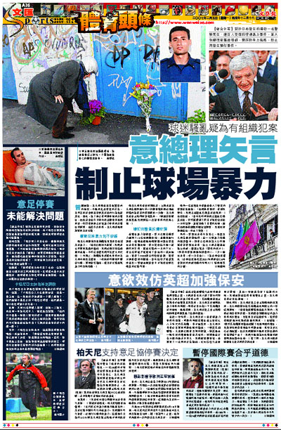 而意大利體育部長梅蘭德里表示要嚴懲足球暴力,「情況已經刻不容緩,我們將立即採取果斷的措施。我們必須切除這頑固的毒瘤,不然它會讓我們付出更大的代價。」本周二,梅蘭德里將就此事件向意大利內閣作出報告。「政府將和體育界聯合行動,採取廣泛措施,使足球比賽遠離暴力和恐怖活動。」