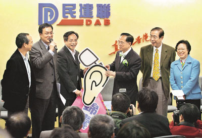 ■曾蔭權到訪民建聯總部,馬力、葉國謙等高層與黨員歡迎特首到訪。 本報記者潘政祁 攝