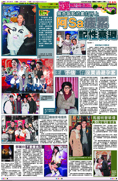 阿Sa最高紀錄試過連續五日只睡三小時為趕戲,可是現發覺年紀漸大,透支過度後,體力絕不及從前,她苦笑指試過洗澡時竟記不起有否洗頭,要再落多次洗髮水,出門後又忘記帶東西,朋友們都著她要多休息,否則可能會連褲子也忘記著就出了街。阿Sa指從小以來也病痛不多,惟這一年多就經常欠缺精神。捱到如此模樣感覺值得嗎?她謂:「我並不討厭這工作,但覺得唱歌和拍戲可以分開來慢慢做,我亦曾向公司反映過,只是公司認為這是巿場的要求,也沒辦法去改變!」