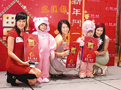 【本報訊】無線花旦胡杏兒、鍾嘉欣與名模陳沛嘉昨日赴澳門為星際酒店新年活動「星際新年狂賞」主持揭幕儀式。在遊戲環節中,身穿火紅色連身裙的嘉欣率先中頭彩,贏得獎金四萬元,果然鴻運當頭。