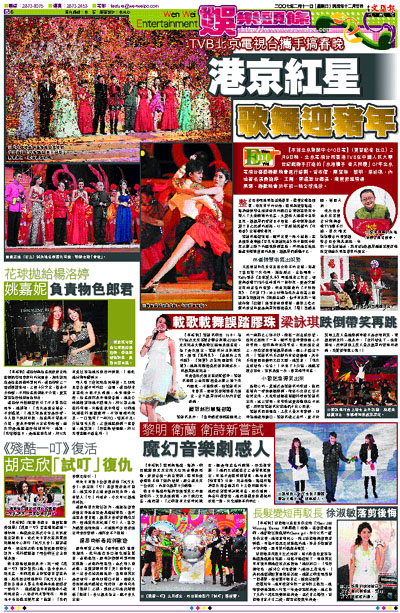 【本報北京新聞中心10日電】(實習記者 杜江)2月9日晚,北京電視台和香港TVB在中國人民大學世紀館聯手打造的「京港攜手 普天同慶」07年北京電視台春節聯歡晚會進行錄製。曾志偉、陳慧琳、黎明、梁詠琪,內地著名演員劉燁、王剛、郭達登台獻演,幾度掀起現場高潮,聯歡晚會於年初一晚全球播放。