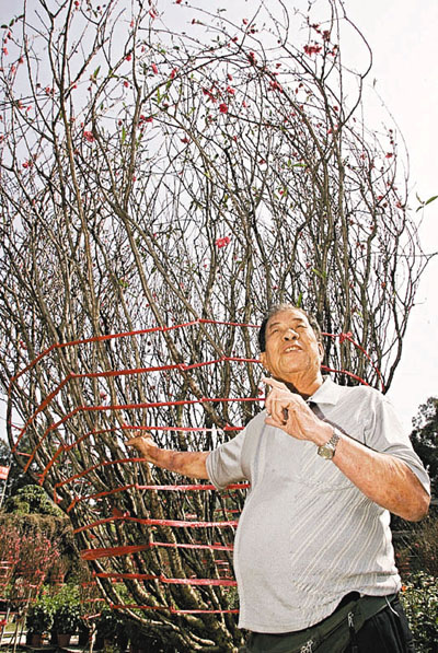 位於大埔林村白牛石的耀記花園種滿桃花,當中有一棵特別高大,近看之下約有十三、四呎。負責人李耀(見圖)表示,該棵桃花王是其心血結晶,用了6年時間栽種,勝在體積大,每日要專人服侍,最重要是殺蟲及施肥,估計只要細心打理,至少可以種多10年。至於桃花王幾錢?李耀笑說:「你喜歡的話,兩萬都算平,不喜歡幾千都嫌貴。」