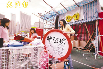 年宵又來了。銅鑼灣維園的年宵市場由下周一(12日)開放,昨日已有工作人員到場搭棚及整理貨物,例如傳統的年花,亦有年輕人為吸引顧客,花盡心思設計創新的攤檔裝飾物及貨物,例如取「特首辦」的諧音,以「特首扮」為題的精品作招徠。 本報記者潘政祁 攝