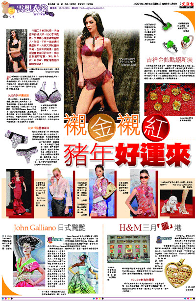 踏入金豬年,為送舊迎新,傳統上都會穿上新的內衣,期望帶來好運,紅色的內衣系列在這節日就最適合,性感之餘,亦相當應節。來自澳洲Chasney Beauty的內衣,設計著重華麗性感,產品用上大量的蕾絲,配上紅色或紅黑色,將女性的魅力盡情發放。比較含蓄的女生,怕蕾絲太成熟,可選wocal的紅色內衣,光身面上帶有點點的閃爍直紋;而Esprit的款式,以休閒作元素,紅色或粉紅色的波點內衣,帶出點點的少女情懷。
