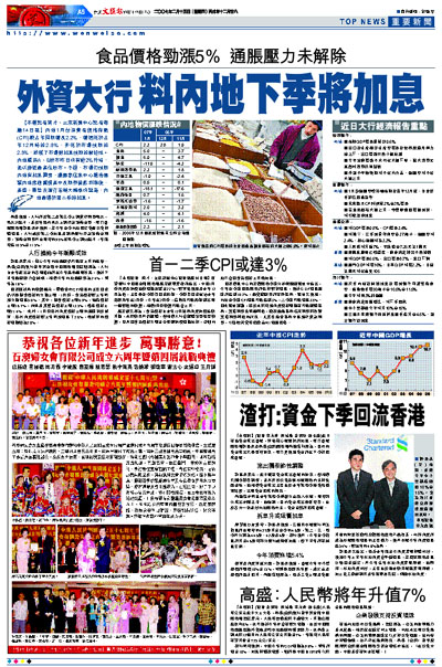 高盛預期,人行將於第二及第三季上調貸存利率兩次,每次27點子,並於年底前再次上調存款準備金率。渣打香港經濟師許長泰亦預測,若今年首季內地固定資產投資持續增長,人行或於第二季加息及調高銀行存款準備金利率,準備金利率料由現時的9.5%按每季上調50點子,年底時達10.5%至11.5%。