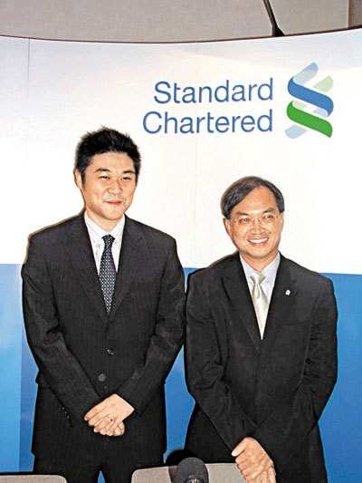 ■許長泰(左)預期,香港今年中小型樓將漲價10%至15%。旁為渣打香港亞洲區總經濟師關家明。本報記者李永青 攝