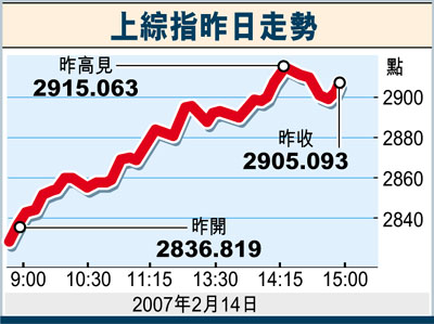 新加坡新思維(NextVIEW)高級技術分析員李欣京亦對本報分析稱,前期暫時的下跌其實是檢驗此輪牛市是否夠「牛」的機會,事實證明「不怕跌、跌不怕、怕不跌」的牛市思維已在充斥市場;加上華人的股市歷來有春節前後圖吉利的看法,節前應維持反覆上升的強勢調整局面,節後則很有可能會很快突破3000點創出新高。今日又能收於2900點以上,樂觀估計甚至有可能在後兩個交易日便有此突破。