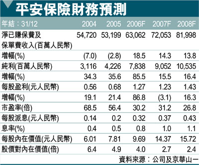 平安保險(2318,簡稱平保)2006年壽險保費收入按年增長17.2%至689.89億元人民幣,佔內地壽險保險市場17%的份額。平保在內地沿海地區的實力強大,如上海、廣東、北京、江蘇、遼寧、山東、浙江、福建、河北及天津。