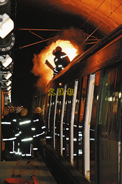 ■西鐵列車車頂爆炸噴火,消防員到場灌救。 樹仁大學新傳系「說.在線」提供