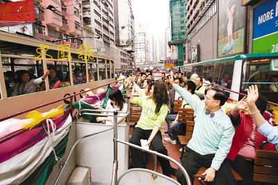 ■曾蔭權伉儷與一眾競選辦職員,沿途上親切地向電車上的乘客揮手問好。 圖片由曾蔭權競選辦提供