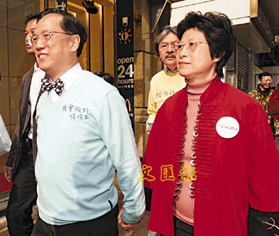 新春伊至,當勞伉儷大年初三搞花車巡遊,在衣著上亦盡顯心思。當勞除了穿上印有競選口號「我會做好呢份工」的粉綠色冷衫外,更配上「招牌」煲呔,以深藍色為背景,輔以10多隻粉紅色豬豬,醒神奪目,更與豬年相呼應,不失莊重之餘,亦產生畫龍點睛之效。曾太亦不讓老公專美,穿上火紅色外套,上半身也「紅噹噹」,並戴上競選「共創好環境」的襟章,含蓄地與丈夫「襯到絕」。■本報記者 郭曉樂
