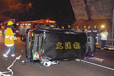 【本報訊】大埔吐露港公路昨晨發生一死一傷車禍。移居荷蘭的一名青年回港度歲,在唱K後乘坐表兄駕駛的七人車回家途中,在廣福h對開一個彎位失控,猛撞鐵欄後再撞向石壆,全車翻側滑行,表弟的頭跌出車外,半邊頭面磨地15米慘死,留下恐怖血路。表兄雖僅受輕傷,但見表弟死狀,激動得握拳呼叫,最後他涉嫌醉駕被捕。