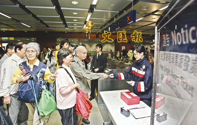 ■西鐵車站職員向市民派發免費單程車票,不少市民索取。本報記者劉國權 攝