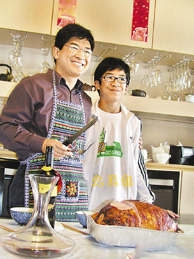 單仲偕父子昨日專誠烹製燒豬腿宴請傳媒。旁為其子,據說還是空手道黑帶高手呢! 本報記者攝