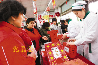 ■大年初二,許多市民早早就到食品店、超市和水果攤購買用精美禮盒包裝的食品,開始走親訪友。 新華社