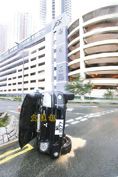 一輛私家車昨午12時35分沿將軍澳寶順路慢駛右轉出迴旋處時,疑因天雨路滑,在唐明街失控向右翻側,女司機郭×豐(44歲)沒有受傷,自行爬出車廂報警,她事後通過酒精測試。 本報記者蔣焯文 攝