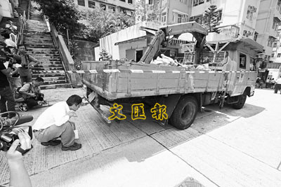 ■當日上環普慶坊工程車倒駛輾斃父女現場。資料圖片