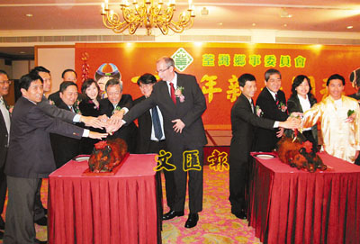 ■鍾偉平主席率眾賓主切金豬慶賀。 本報記者鄭群 攝