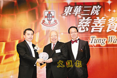 【本報訊】東華三院為籌募添置醫療儀器費用,日前假尖沙咀香港洲際酒店舉行東華三院慈善餐舞會,敦請律政司司長黃仁龍蒞臨主禮,並在東華三院主席劉金國陪同下致送紀念品予大會贊助人及接受善長交贈捐款支票。