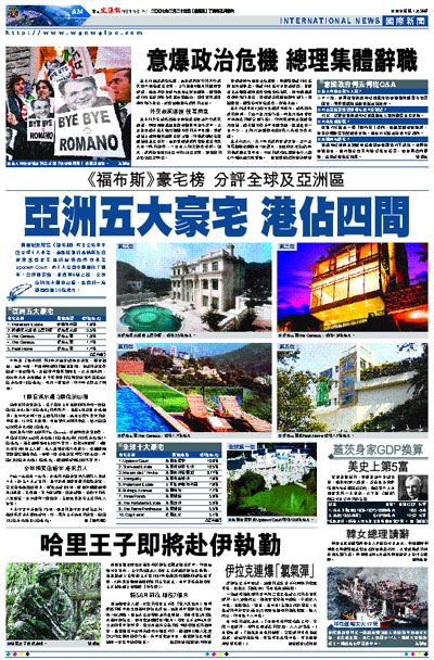 亞洲區的豪宅排名,除了榜首土耳其伊斯坦布爾一座價值1億美元(約7.8億港元)的府第外,其餘4間都是香港物業。其中深水灣一座三層高的別墅,擁有15萬平方呎的豪華花園,75呎長大泳池,可眺望深水灣的景色,估計價值4,500萬美元(約3.5億港元),
