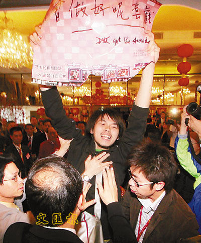■酒會中途,突然有人高舉大字示威,曾蔭權微笑面對。
