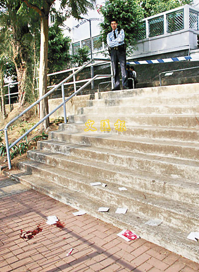 ■八旬老婦滾下10級樓梯現場,遺下一灘血漬。 本報記者溫瑞麟 攝