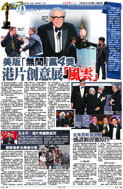 【本報訊】(記者 洪永起、焯羚)港產片《無間道》無緣問鼎奧斯卡,改編自原創港片的荷里活影片《無間道風雲》卻連奪最佳電影、最佳導演、最佳改編劇本、最佳剪接四獎。消息傳來,港人心裡十分矛盾─港產創意獲殊榮,當然欣喜;但是,為什麼自己偏偏不能出人頭地?問題是:我們懂不懂得發揮創意?尊重創意?原作《無間道》本是一個推銷數年、卻無人問津的劇本,幾經波折拍成電影,在香港電影市道低迷之際上畫,結果高收三千多萬港元,締造票房神話,引起西方注意。它的成功並非一帆風順。
