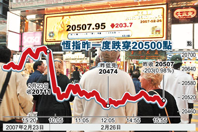 內地股市於新春假期後重開,加上港股期指結算前夕,港股一如市場所料地下跌。恆指一度跌237點。午後內地股市由跌轉升並創出新高以紅盤收市,港股跌幅亦見收窄,全日跌203點,報20,507點,總成交進一步降至440億元。證券界認為,恆指已跌至20天線20,500點水平,有機會向下回調至20,083點50天線水平。若美股今晨再挫,恆指大有機會失守20,500點,即月期指料於20,300點水平結算。