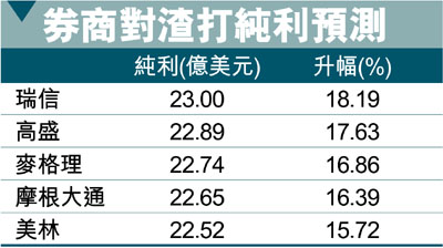 是次業績為渣打新任行政總裁冼博德上任後的首份成績表。多間證券行中以瑞信的預測最為樂觀,估計純利將達23億美元,按年增長18.19%。