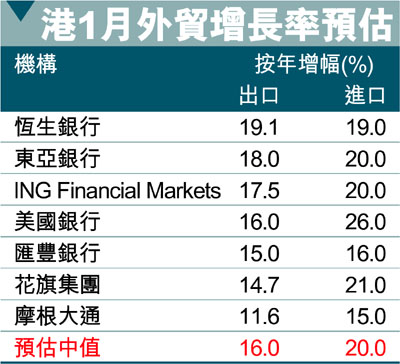 路透調查顯示,本港1月出口值可能較上年同期增長16%,增速高於去年12月的13.7%;進口值則預計按年增長20%,亦高於12月的14.5%。