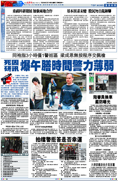 【本報訊】(記者 陳美琪)轟動全城的連環殺警案進入第2日死因研訊。庭上除了透露相信是梁成恩遇害前與一名警員的通話內容,亦有警方證人爆出梨木樹警署警員當更時的種種流弊,包括梁成恩於遇害當日,沒有按正常程序於午膳時交出佩槍等裝備;他的拍檔亦不諱言,沒有跟從「更表」指派,同事擅自「孖咇」出巡,亦承認午膳前後3小時1名警員需分身巡邏2個小區,削弱警力。