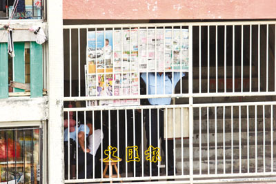 ■警員以報紙緊封石桃樓4樓及5樓梯間,以防陪審員面貌曝光。 本報記者蔣焯文 攝