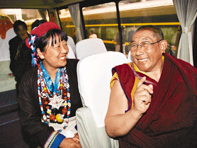 ■出席今年全國「兩會」的西藏代表和委員,昨日乘坐穿越青藏鐵路的列車抵達北京。他們亦是首批抵京的代表和委員。新華社